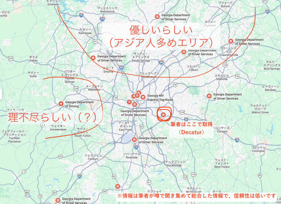 で、狙い目は先ほど言った通り、 アトランタ北の方のアジア人が比較的多いところか、あるいは少し貧困層が多い東の方がいいらしいです。 貧困層が多いエリアは運転も荒めなので、採点基準も緩いんだとか。あくまで噂レベルですが(笑)